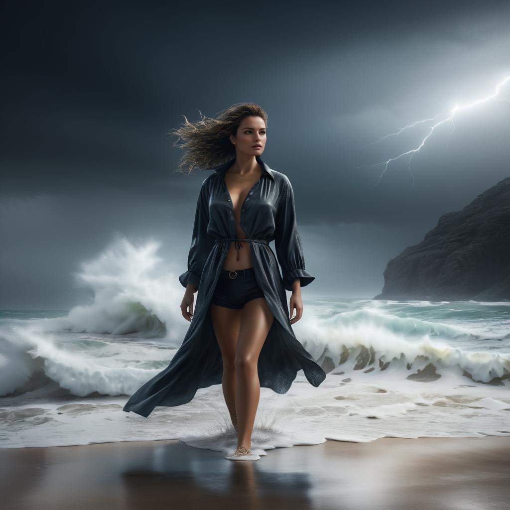 Woman in a stormy beach, photorealistic, with epic lighting, insanely detailed and cinematic atmosphere.
