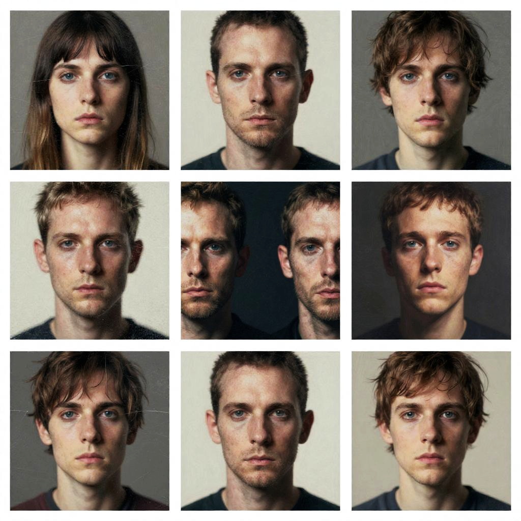 Radio Head album covers homage in retro-futuristic style, neon lights and geometric shapes, distorted human figures with expressive faces, high contrast colors, nostalgic yet innovative appearance