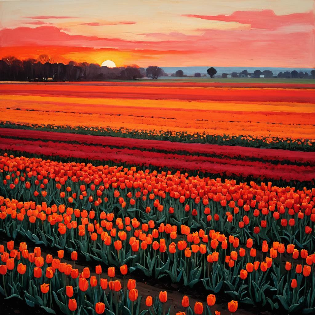 Abstract expressionist painting of vibrant crimson and orange tulip fields under a bold, sunset sky in the style of Mark Rothko. The artwork features soft brush strokes capturing the peaceful countryside with rows of blooming tulips and a large setting sun on the horizon. High quality, vivid color contrast emphasizing tranquility and natural beauty.