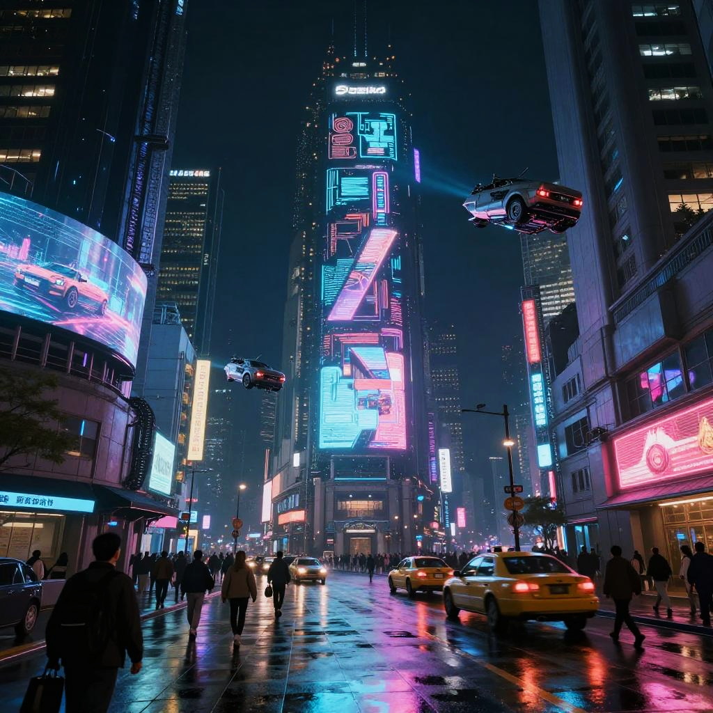 AI generated video art focused on a cyberpunk cityscape at night, neon signs flickering, holographic advertisements, seamless motion of bustling crowds and flying vehicles, detailed and atmospheric with a techno-futuristic vibe