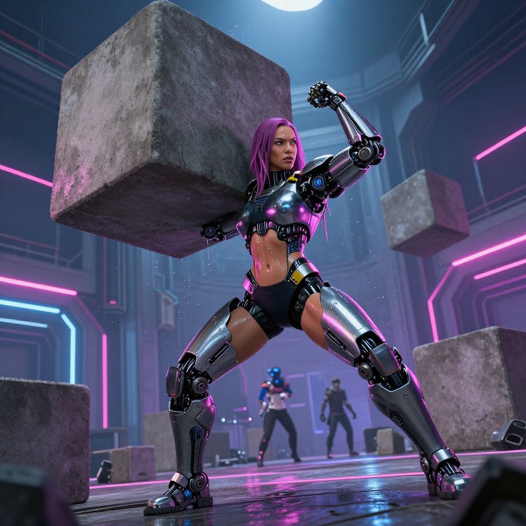 CGI image of a purple-haired woman in shiny black cybernetic armor, flexing her arm while lifting a concrete block in a neon-lit