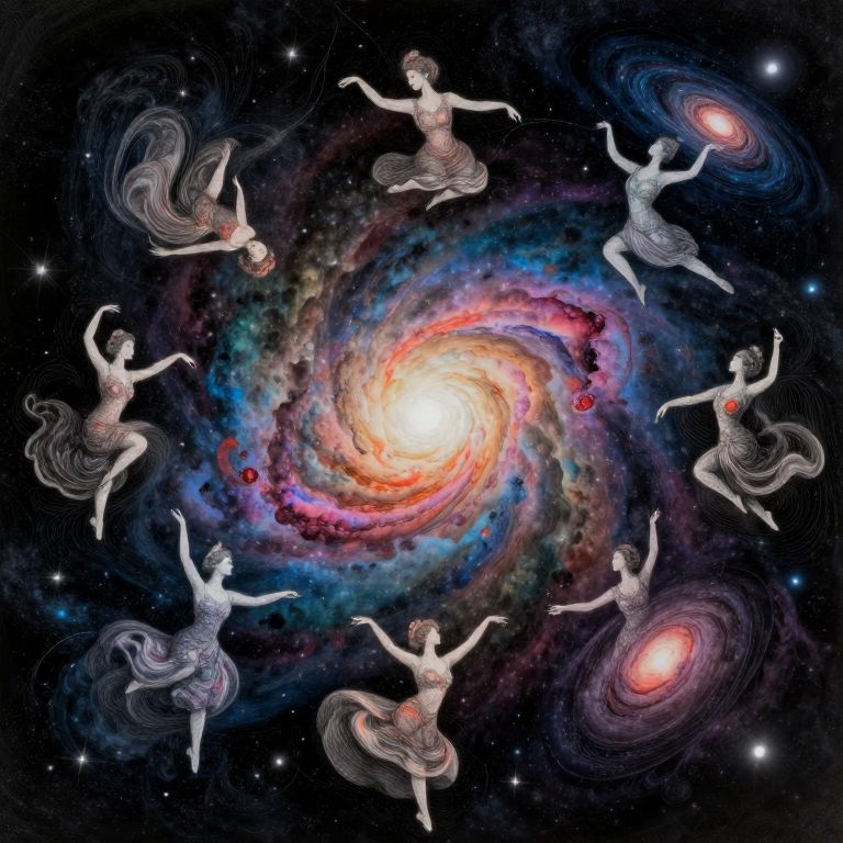 Craft an awe-inspiring digital artwork that seamlessly blends intricate pen-and-ink details with a vibrant color palette. Depict celestial performers composed entirely of swirling galaxies and nebulae gracefully dancing in the night sky, their movements echoing the cosmic ballet of stars and planets. This unique scene should be viewed from an aerial perspective above the dancers, highlighting the intricate details of each dancer's formation while diffused light illuminates the dark canvas with a sense of magic and wonder.