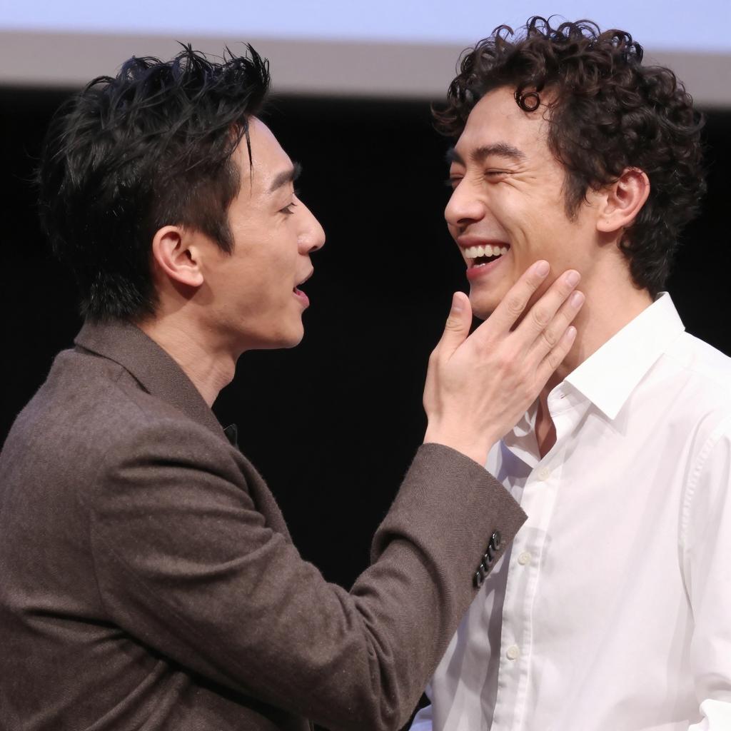 Two naked men, back-to-back, with long black hair and dark brown hair, embrace intimately. The man on the left holds a guitar with a detailed strap. Purple stage lighting fills the background. Their faces are close, intense expressions.