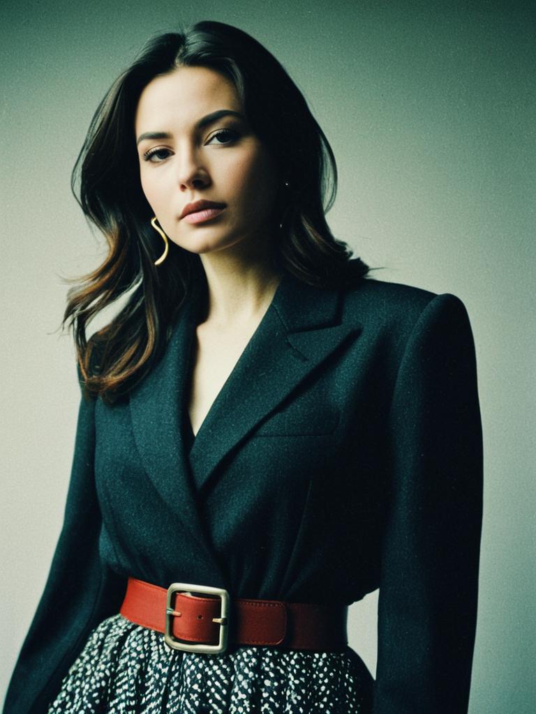 Woman in Designer Outfit, waist-up editorial portrait, photorealistic tones