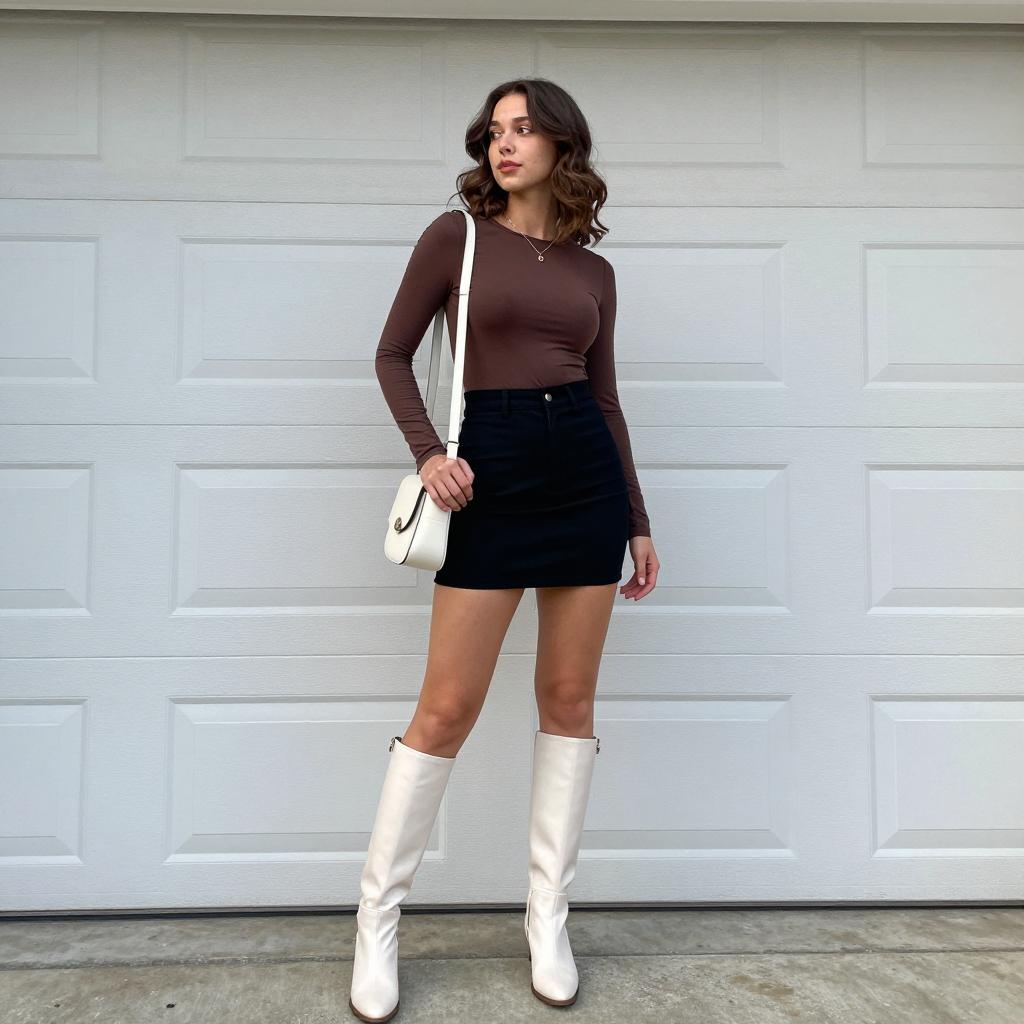 Woman standing indoors, wearing a black long-sleeve top, black leather mini skirt, black ankle boots, and black cap. She has glasses, long brown hair, and holds her cap with one hand. She carries a black chain-strap clutch in her other hand. Background features white paneled doors and a marble floor. She is centered in the image, facing forward.