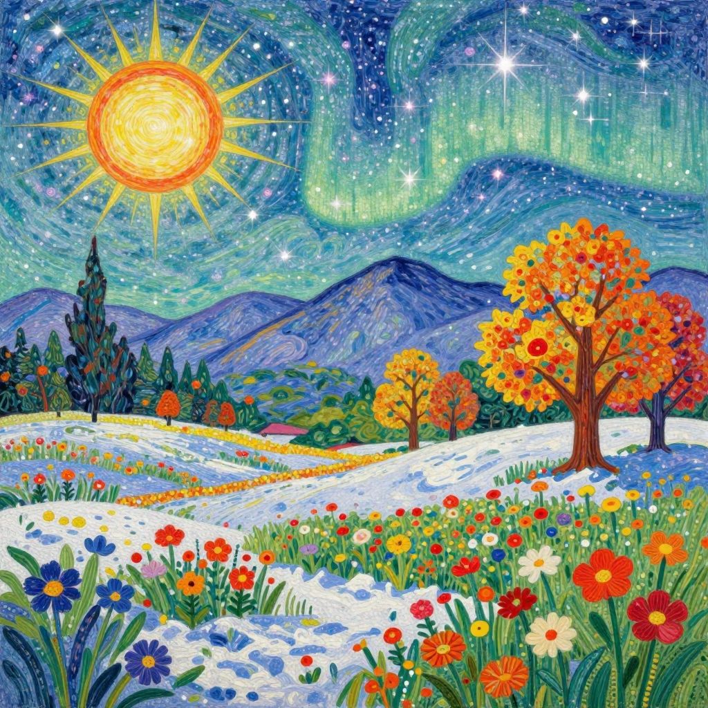 Colorful pointillism painting depicting a whimsical landscape with snow-covered fields, vibrant wildflowers, autumn trees, and distant mountains under a shimmering aurora sky. The large radiant sun refracts light with cosmic sparkle, blending Eric Carle's children's book palette and Van Gogh-inspired style to create an enchanting, magical universe.