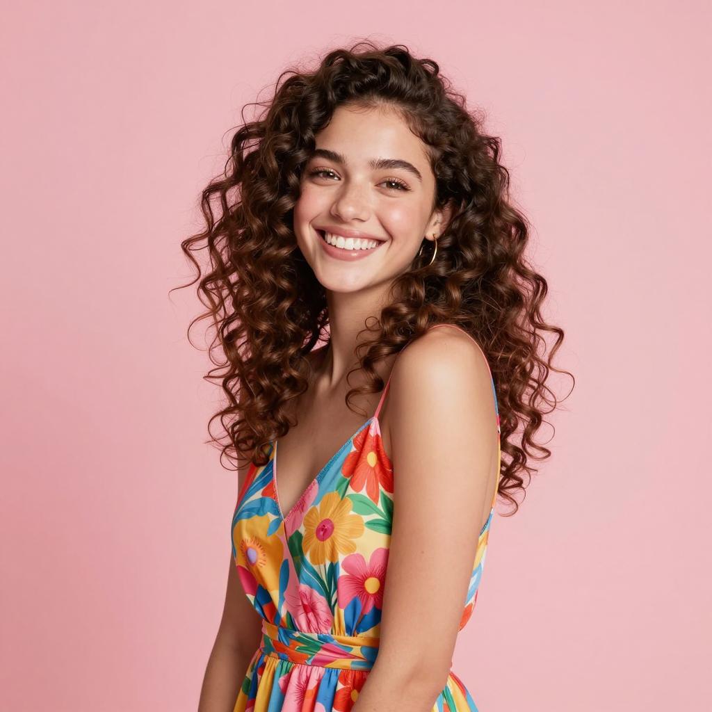A confident young woman with curly hair smiles while standing in an art studio. She wears denim overalls over a white sleeveless top. Behind her are several large, realistic painted portraits featuring her likeness, highlighting detailed contemporary portrait art with warm tones.