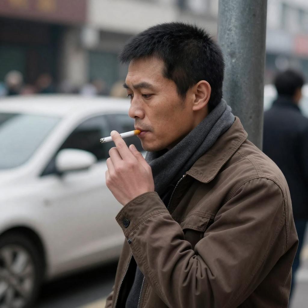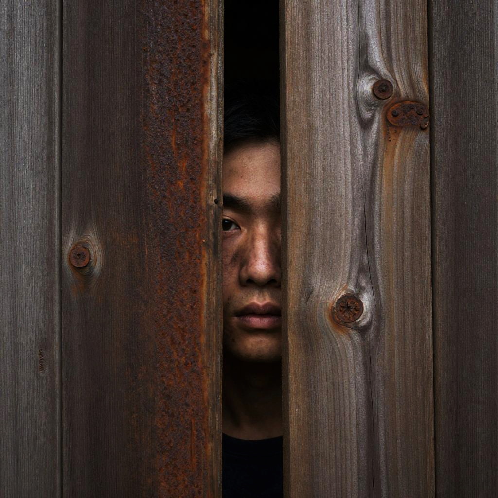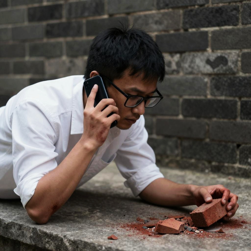 Young Asian man with short black hair and glasses, wearing a white shirt with rolled-up sleeves, lying on a concrete surface. He is holding a broken red brick with bloodied hands and speaking on a black smartphone. The background features a dark, worn brick wall, and the man appears focused.