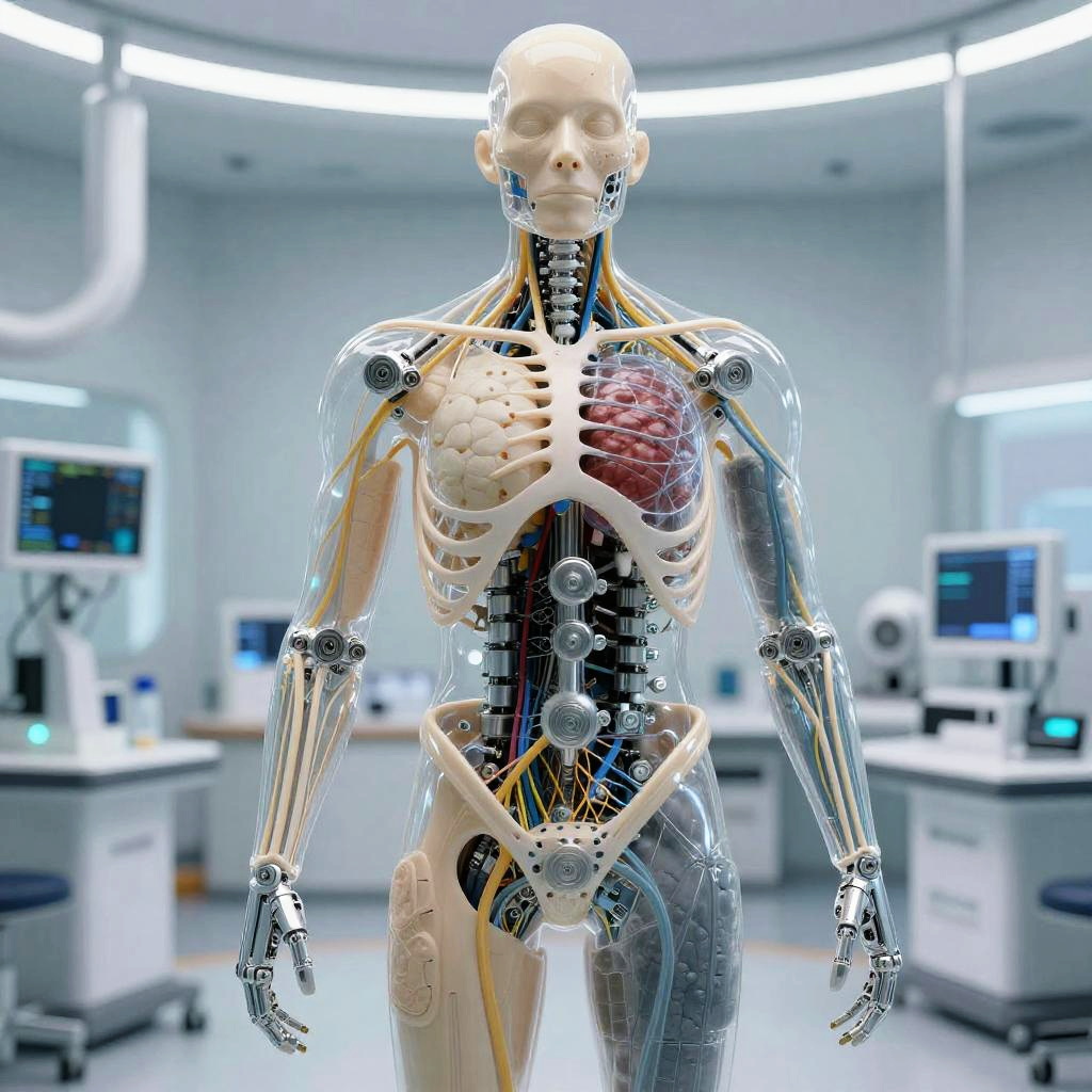 AI generated body shown as a conceptual anatomical model combining digital elements and biological features, with transparent layers revealing neural networks and robotic servo motors, placed in a futuristic medical environment with soft ambient lighting.