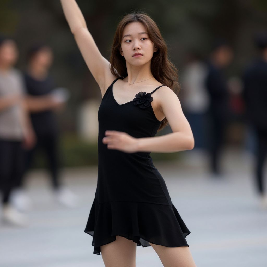 Photograph of an Asian woman with a sleek black bun, standing confidently in a navy blue, sleeveless, high-slit dress. She wears tan high-heeled sandals. Her pose is strong with one hand on her hip and the other arm relaxed. The background is slightly blurred, showing several people in casual clothing and trees, indicating an outdoor setting. The lighting emphasizes her toned physique and smooth skin. The overall style is modern and elegant, highlighting her dancing or modeling prowess.