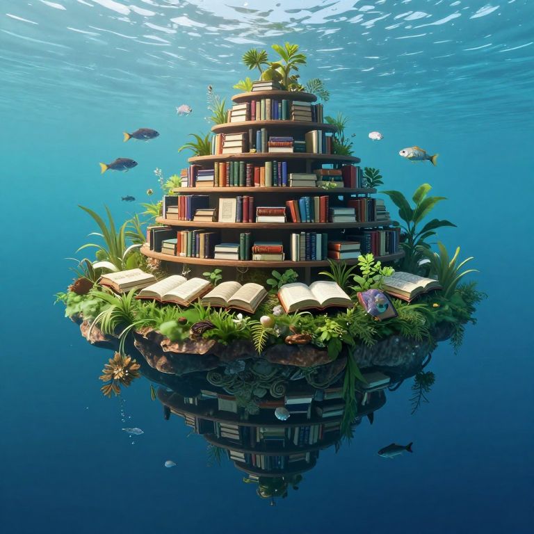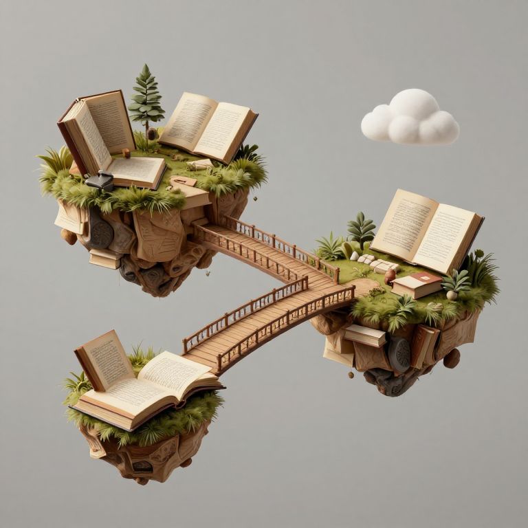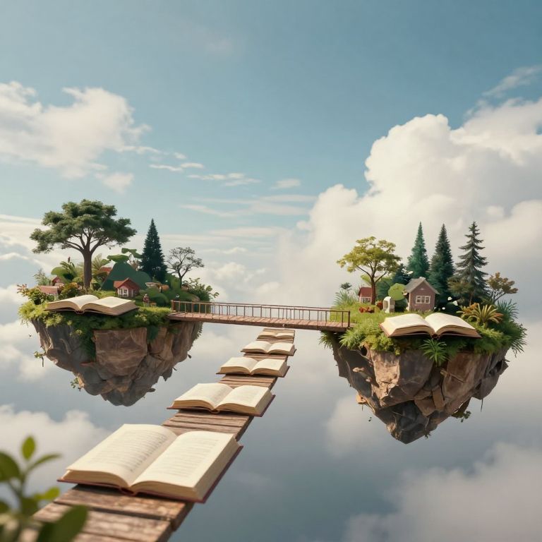A bridge connects two floating islands made of books—each book, when touched, alters the terrain in an unpredictable literary realm.