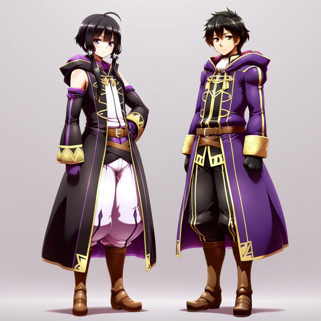 Digital illustration of two anime-style male characters standing side by side wearing purple and black long coats with gold trim. Both have black hair, brown boots, and gloves. One character has purple eyes and puffy white pants, while the other wears fitted black pants. Their outfits feature belts and hooded designs, with a fantasy or RPG aesthetic inspired by Fire Emblem.