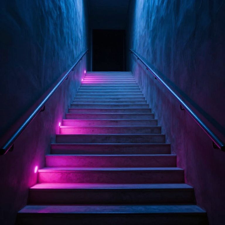 An ethereal ascent of neon-lit stairs beckons with a paradoxical allure, merging the promise of transcendence with the enigmatic void, where each step echoes with the tension of hope and uncertainty.