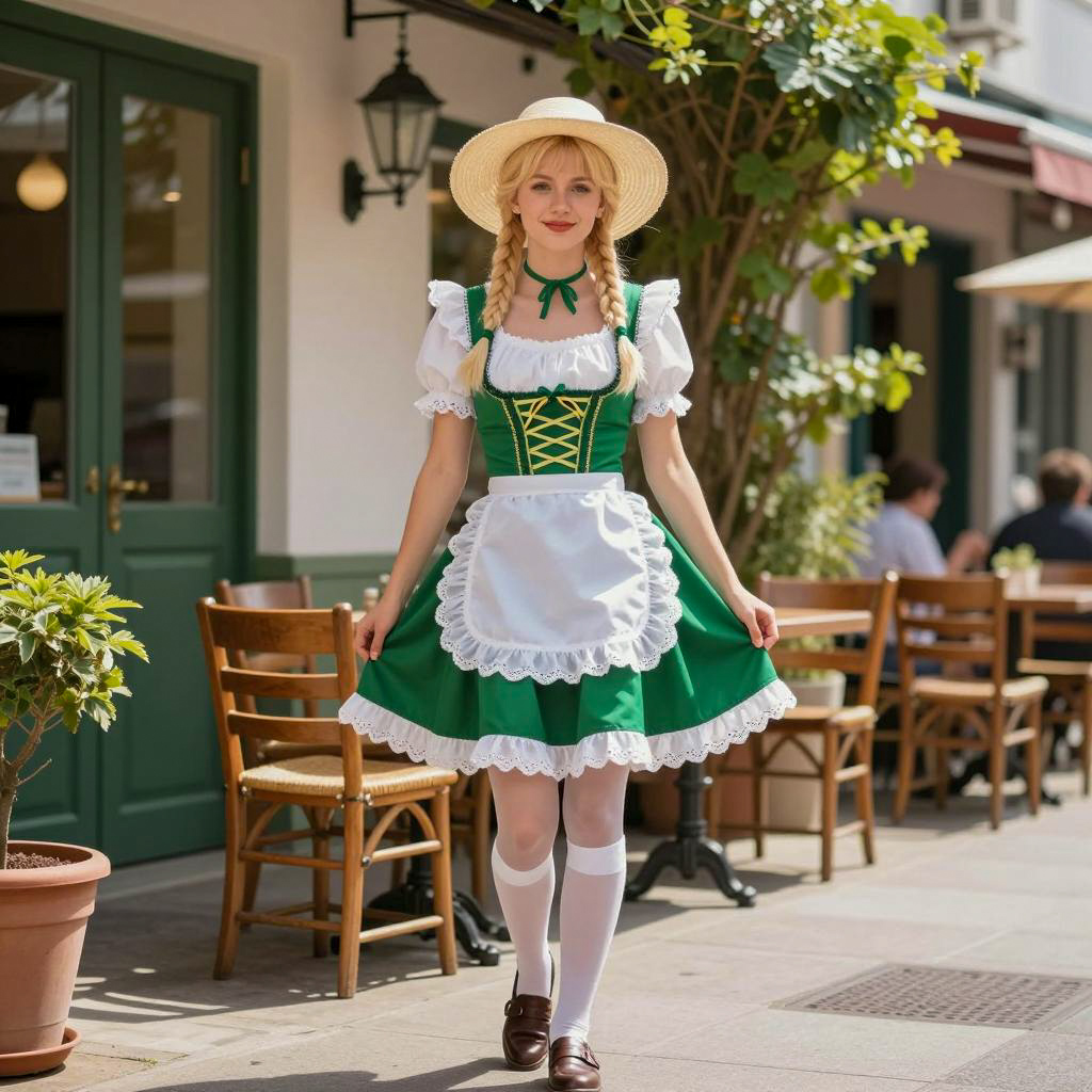 Irish waitress costume, photograph of a cute blonde woman in a German-style dirndl, standing outdoors on a sunny street, green dress with white apron, puffed sleeves, lace trim, brown leather shoes, white stockings, braided hair, wide-brimmed hat, green choker necklace, background includes wooden chairs, green doors, hanging lantern, leafy plants, daytime, summer, realistic, detailed, street café setting, natural light