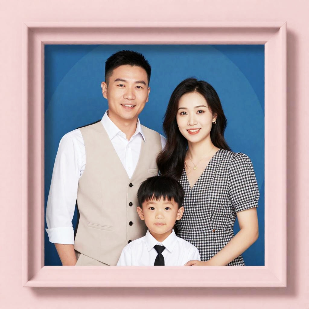 Photograph of a family portrait in a pink frame. Man in white shirt and beige vest, woman in black-and-white checkered dress, and young boy in white shirt and black tie. All smiling. Background: blue wall with circular design.