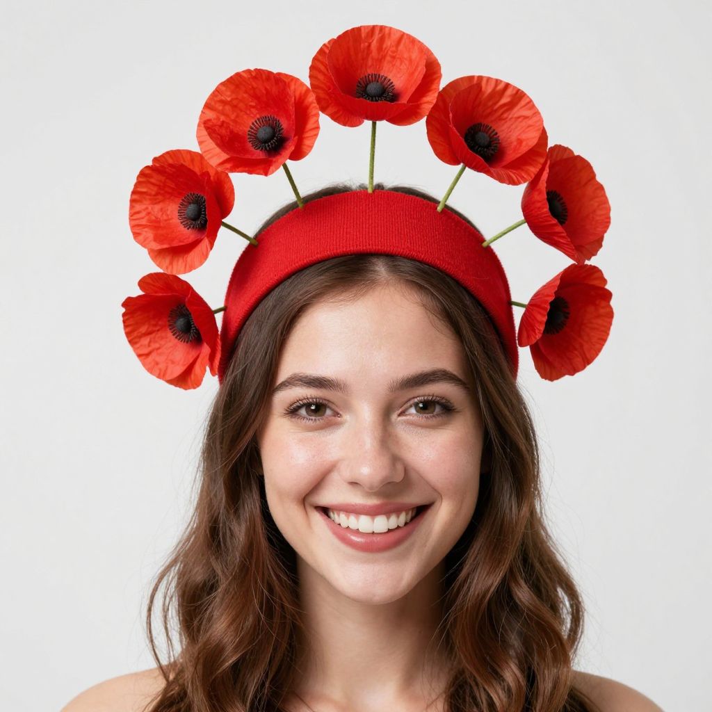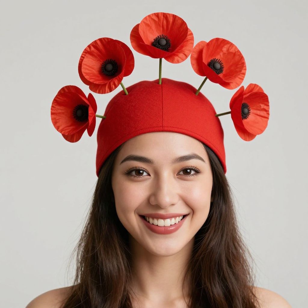 Woman wearing a vibrant red headdress adorned with six poppy flowers, smiling cheerfully against a plain background.
