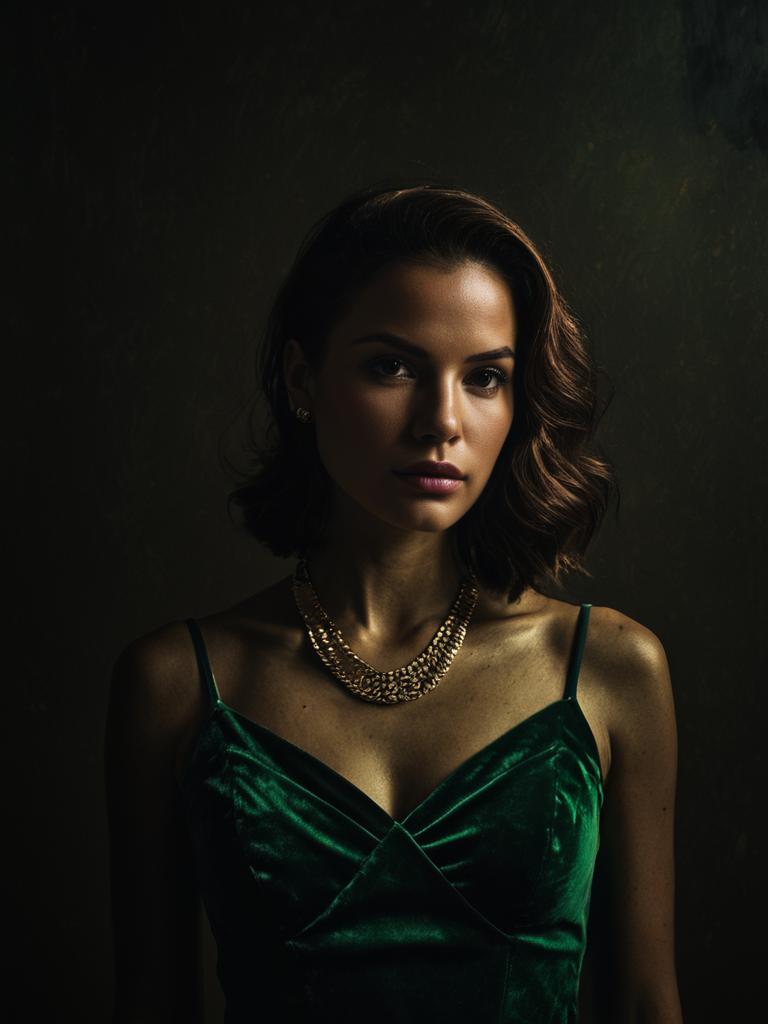 Portrait of a young woman with medium-length brown hair wearing a dark green off-shoulder sweater dress with long sleeves and a high-low hemline. She accessorizes with a long silver necklace featuring a pendant. She wears brown thigh-high boots and poses against a textured dark background.