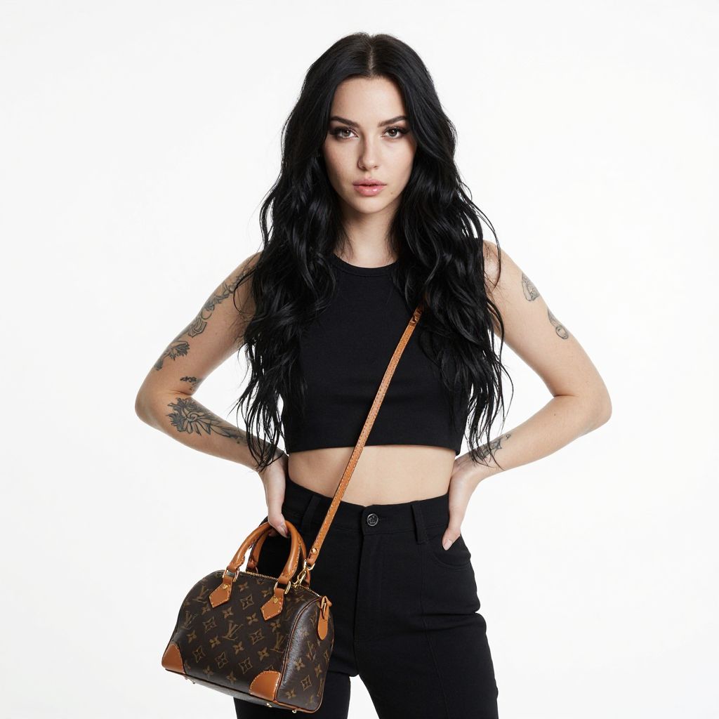 Photograph of a young woman with long, wavy black hair and pale skin, standing against a bright white background. She's wearing a black crop top, black high-waisted pants, and has visible tattoos on both arms. She's holding a black Louis Vuitton purse with brown accents at her hip. Her expression is neutral, and she's looking directly at the camera.