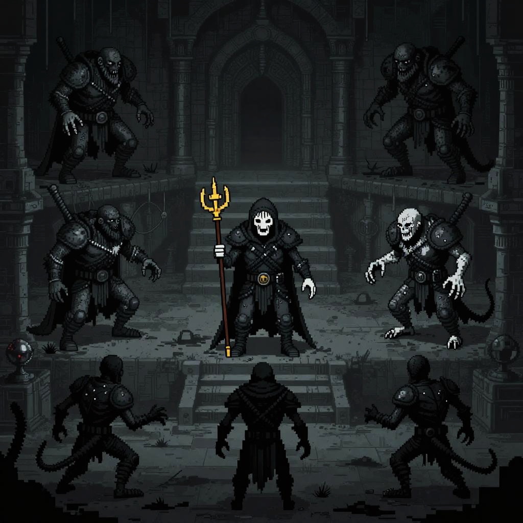 Darkest dungeon sprites featuring a grim, hand-drawn pixel art style, showcasing tortured heroes and monstrous foes in a claustrophobic dungeon environment, highlighting eerie shadows and twisted, intricate designs, invoking an intense, haunting vibe.