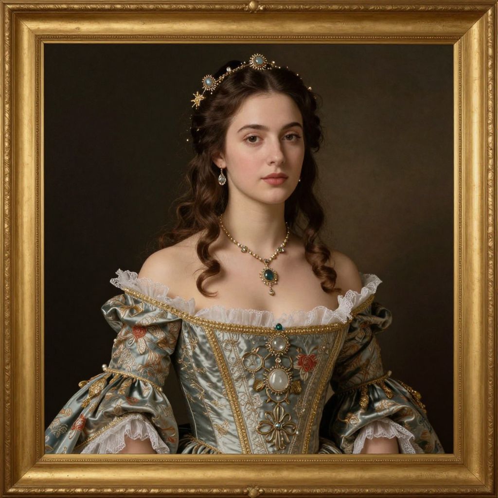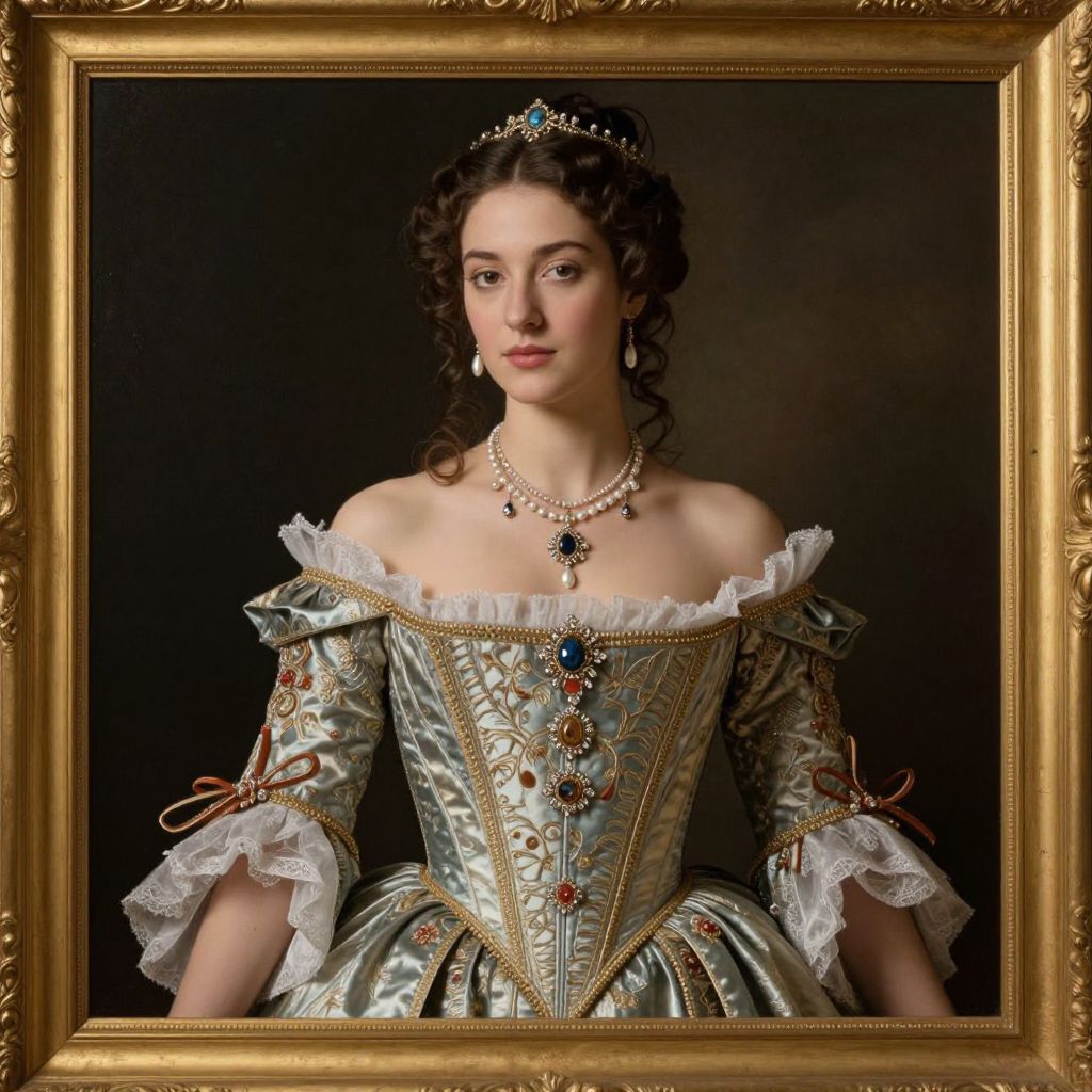 Elegant portrait of a woman in a regal setting, featuring intricate attire with off-the-shoulder sleeves, a corseted bodice, and delicate jewelry, framed within a golden border, reminiscent of classical art styles.