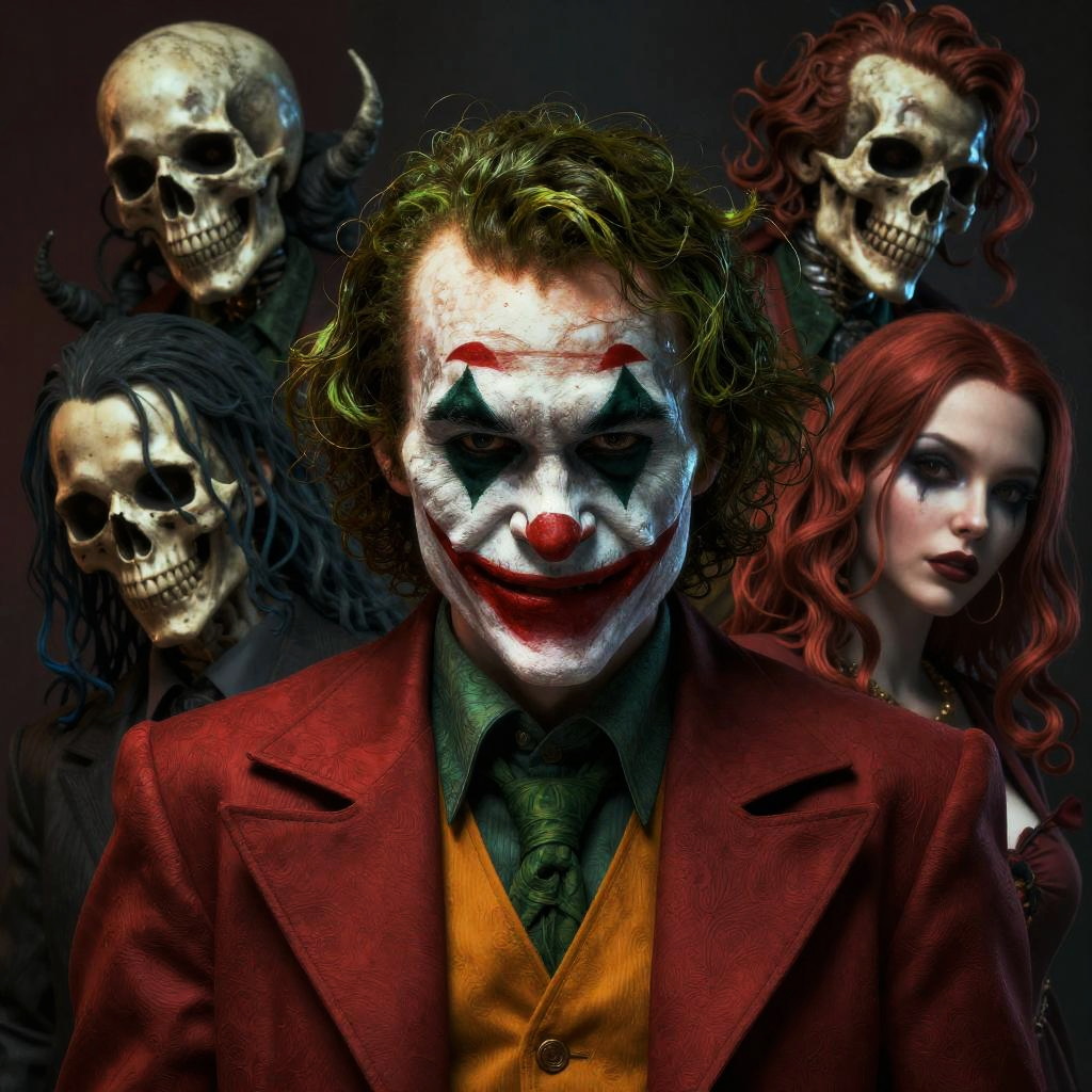 Digital art: Joker with white face paint, red nose, green hair, red blazer, surrounded by four grinning skulls and a red-haired woman