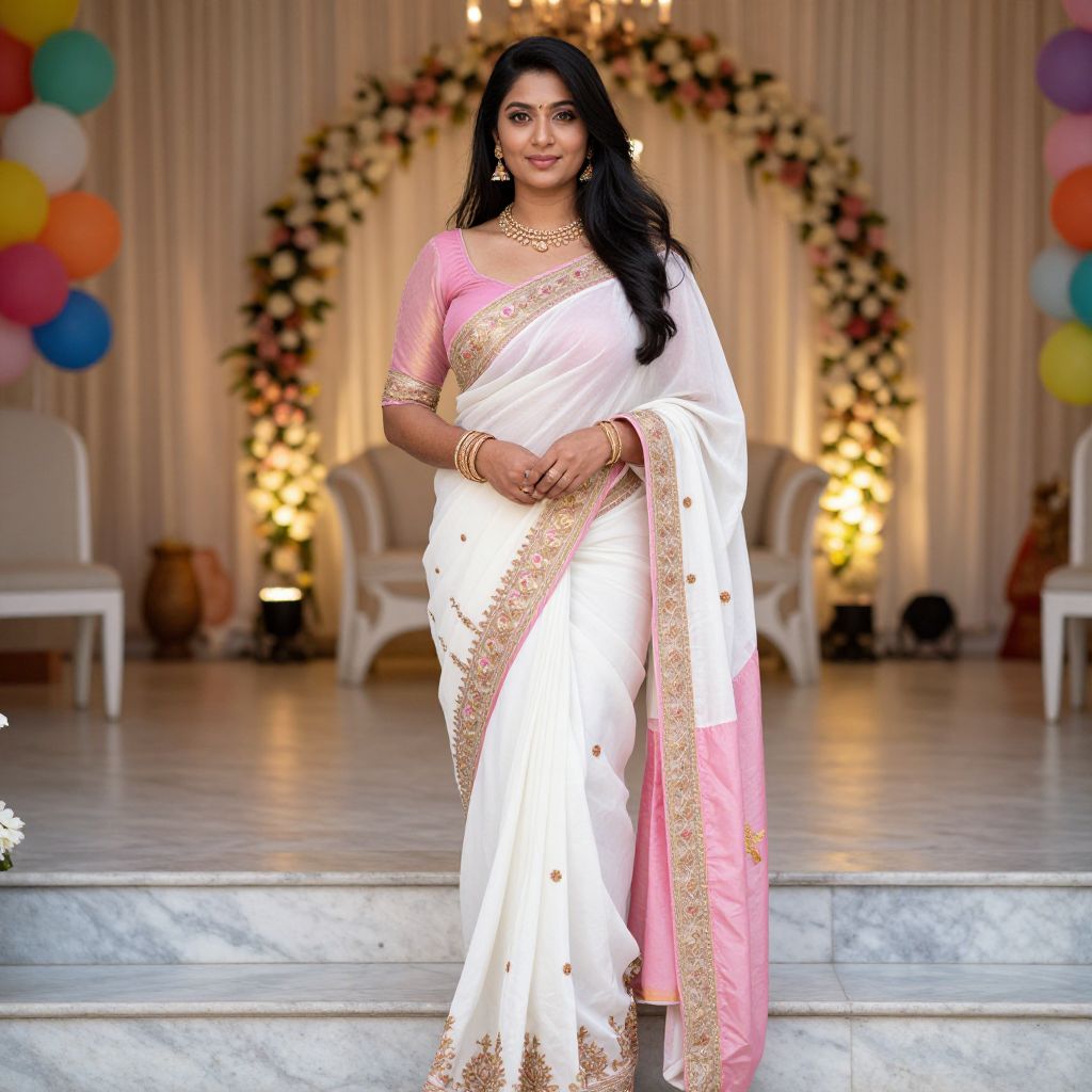 A graceful wedding saree woman in her 30s with long black hair flowing past her shoulders and delicate amber eyes, dressed in a hand-embroidered white and pink bridal saree with golden zari work, standing on a marble step at a South Indian wedding venue with colorful balloons and floral arches, the outfit highlighted by soft golden hour lighting.. The woman has big tits and cute face