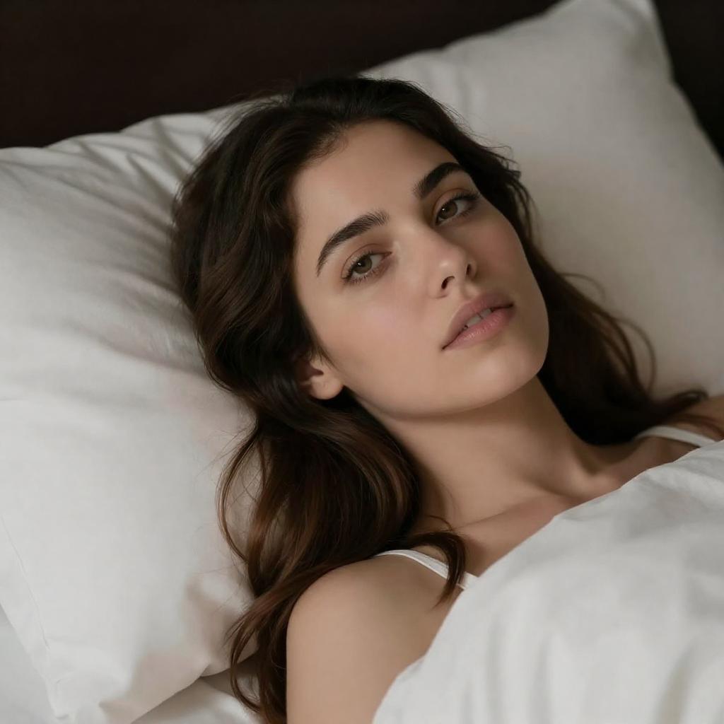 Photograph of a young woman with long brown hair, light skin, and freckles, lying on a bed with blue pillows. She looks to the side with a slight smile. The background is dark, and she is partially covered by a white blanket. The image has a warm, slightly grainy ure.