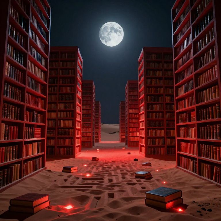 A labyrinthine desert of towering bookshelves bathed in crimson light stretches toward a luminous moon, where scattered volumes glow like embers in the sand, defying gravity and expectation.