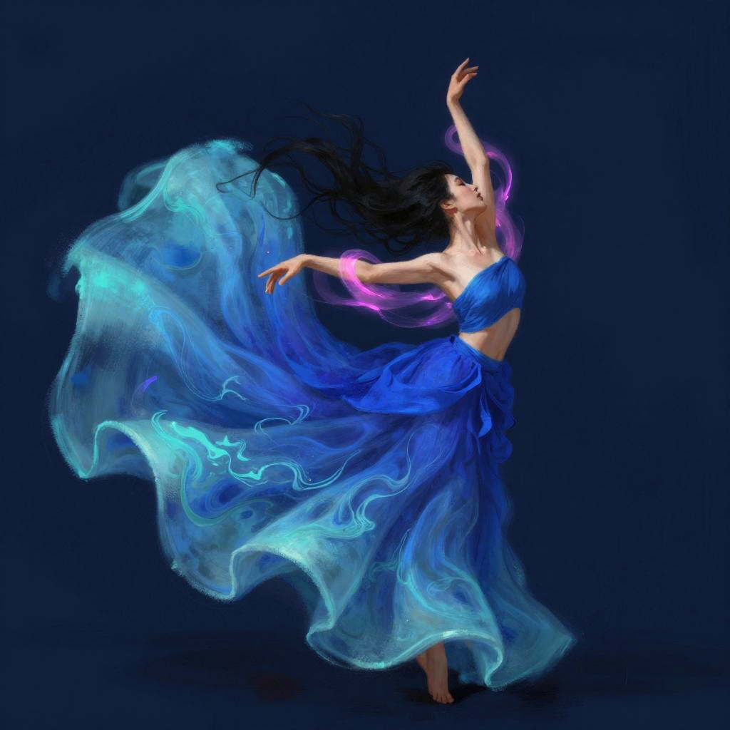 Digital painting of a woman with flowing black hair dancing in a swirl of vibrant blue and turquoise fabric. Her back is to the viewer, arms gracefully extended, with pink and purple light accents. The background is a deep, dark blue, creating a dramatic contrast. The fabric appears almost ethereal, with fluid, painterly textures. The overall style is fantasy-inspired, with a dynamic, almost magical feel.