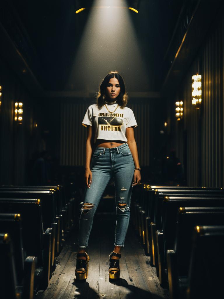 A young woman standing confidently in a dimly lit theater aisle under a spotlight. She is wearing a cropped white graphic t-shirt with black and gold print, light wash skinny denim jeans with distressed knee details, and black high-heeled platform sandals. She accessorizes with a choker necklace and layered chains. The background features rows of dark seats and warm wall sconces.