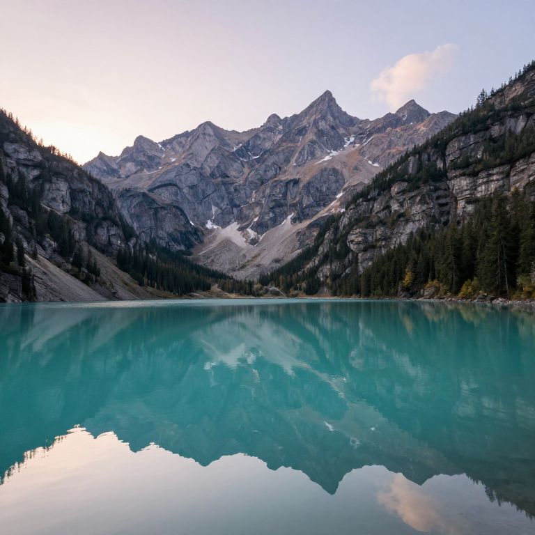 Serenity whispers through the turquoise embrace of a mountain lake, its mirrored surface cradling the sky's soft caress, while the rugged peaks stand as silent sentinels of timeless tranquility.