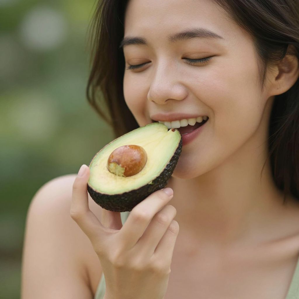 Radiant joy and the simple pleasures of life converge as a woman savors the creamy texture and earthy aroma of an avocado, embodying a moment of pure contentment amidst the gentle embrace of nature.
