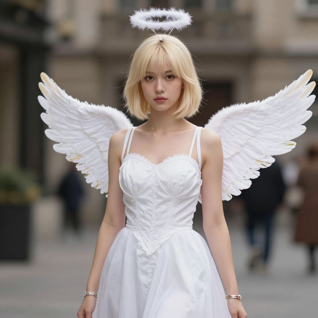 Digital artwork of a blonde woman with a halo, white angel wings, and dress, standing in a blurred urban background.