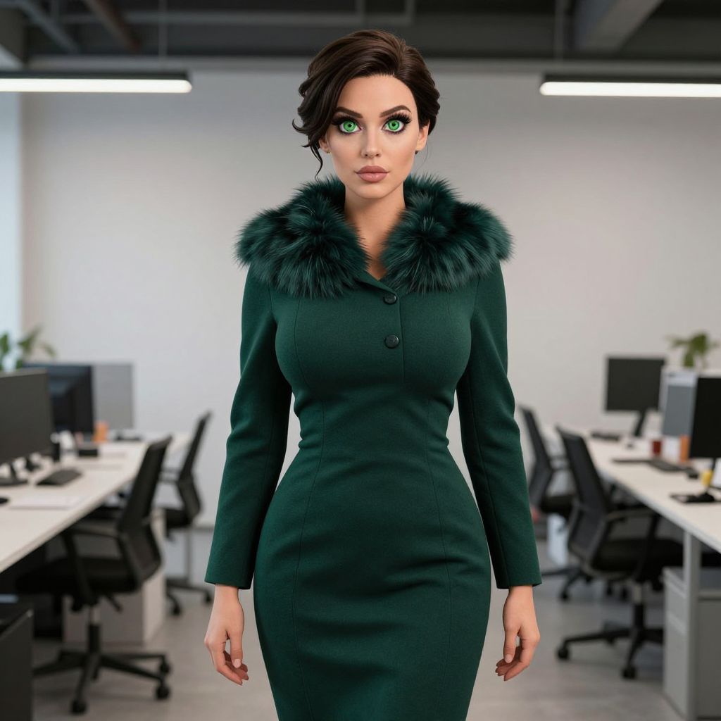 A detailed portrait of a woman with large, expressive green eyes and a sharp jawline, wearing a dark green woman's coat office wear with a fitted silhouette and a faux fur collar, standing in a minimalist office with industrial furniture and ambient lighting, the outfit blending office wear with a theatrical costume element, giving a creative, fashion-forward aesthetic. The woman has big breasts and cute face