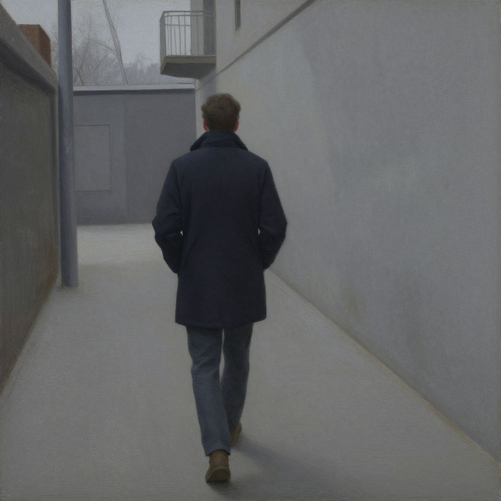 Concept art mood painting environment painting man walking down grey dull concreate alley winter arms in pockets. style of ryan church jon mccoy george hull painting