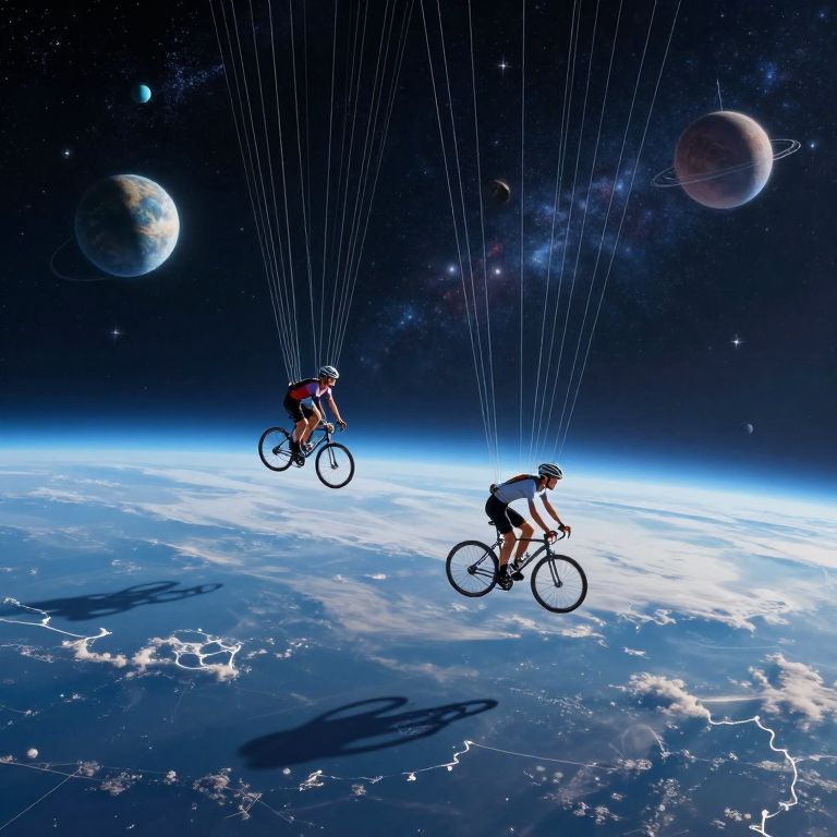 Two cyclists navigate a surreal cosmic landscape, pedaling bicycles suspended by ethereal threads above a vast planet, with smaller celestial bodies drifting nearby under a star-studded sky.