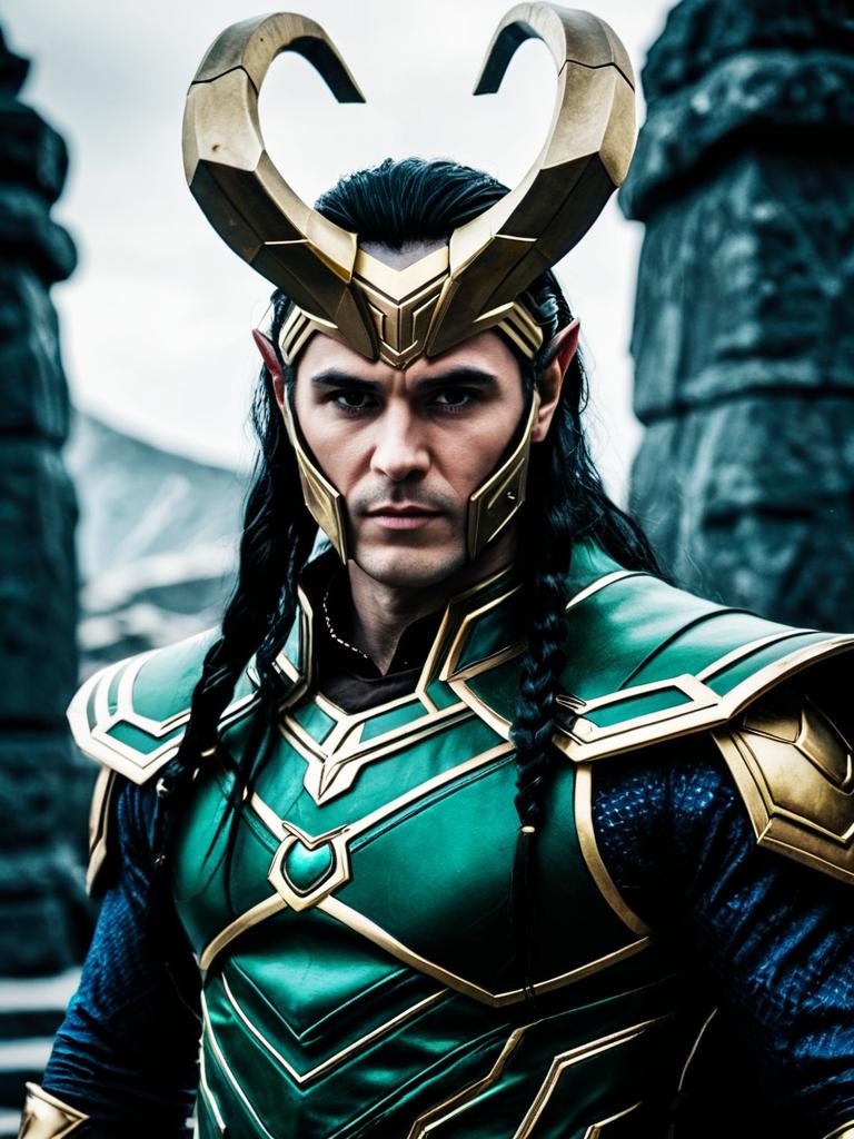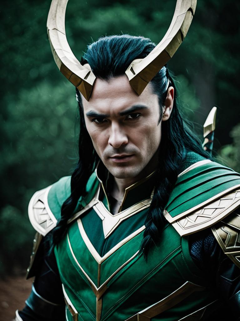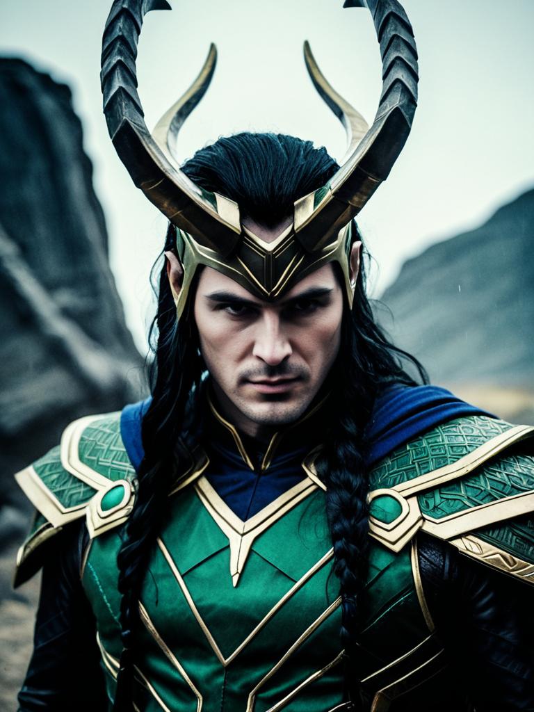 Man in Loki Ragnarok Cosplay, cinematic realism, dramatic cosplay portrait