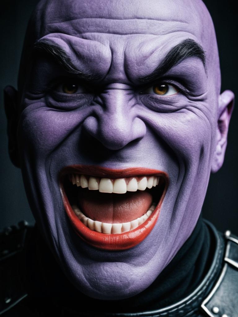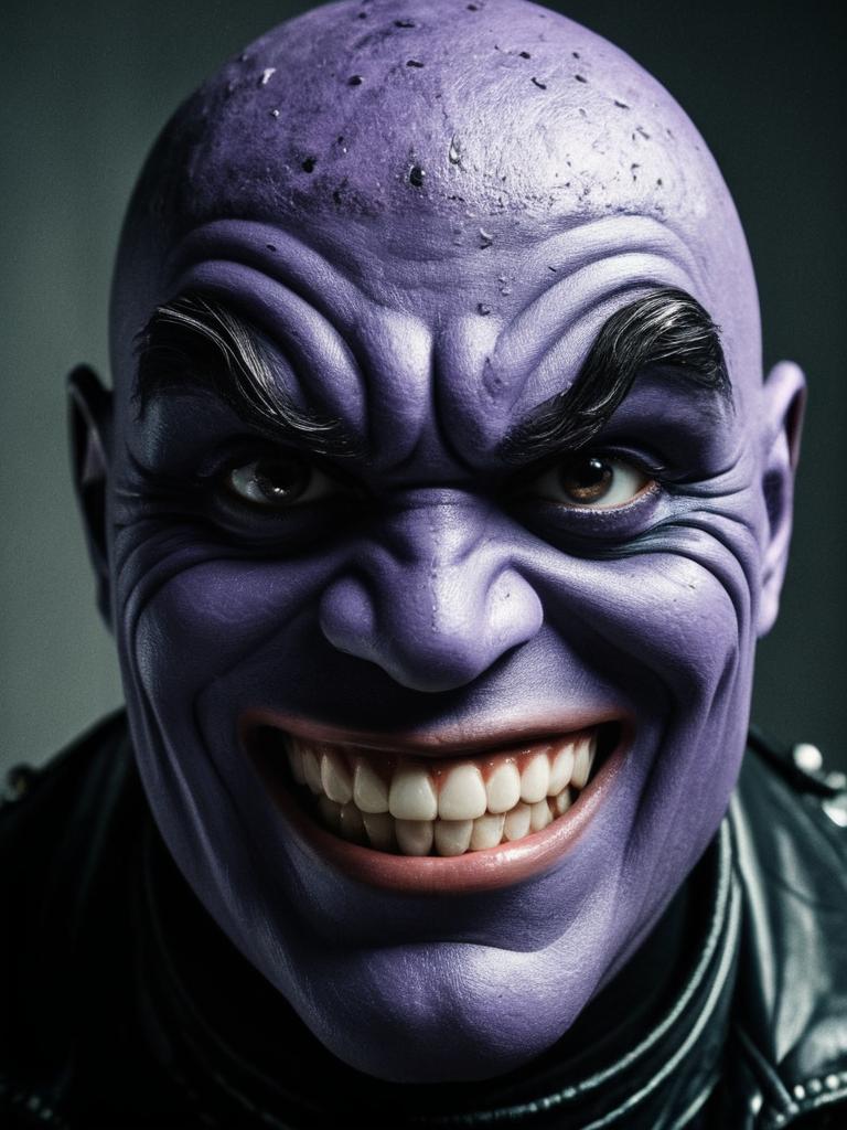 Man in Grimace Costume, close-up detailed headshot with round features