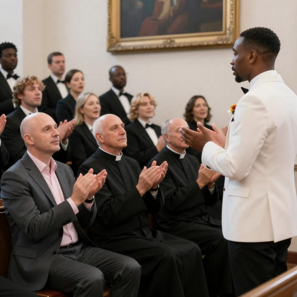 Photograph of a diverse choir in formal attire, standing and seated in a church. The bald, middle-aged man in a pink shirt and striped suit sits on the left, clapping. A bald, older man in black clergy robes sits beside him. A man in a white suit stands to the right, leading the group. Background includes church pews and a painting.