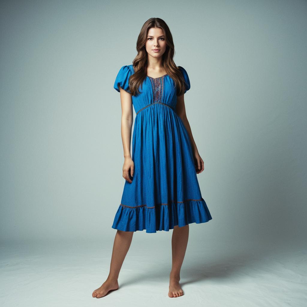 Portrait of a young woman with brown hair wearing a multicolored patterned dress and elegant jewelry, standing outdoors in front of a large tree. The realistic image shows her holding the sides of her dress in a natural, green park setting.
