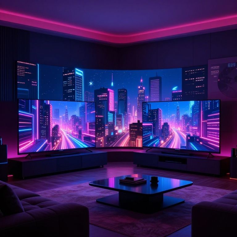 Televisores modernísimos en una sala de estar futurista, con pantallas curvas y colores vivos, reflejando una ciudad iluminada de noche, estilo cyberpunk, alta resolución, detalles tecnológicos avanzados y ambiente dinámico.