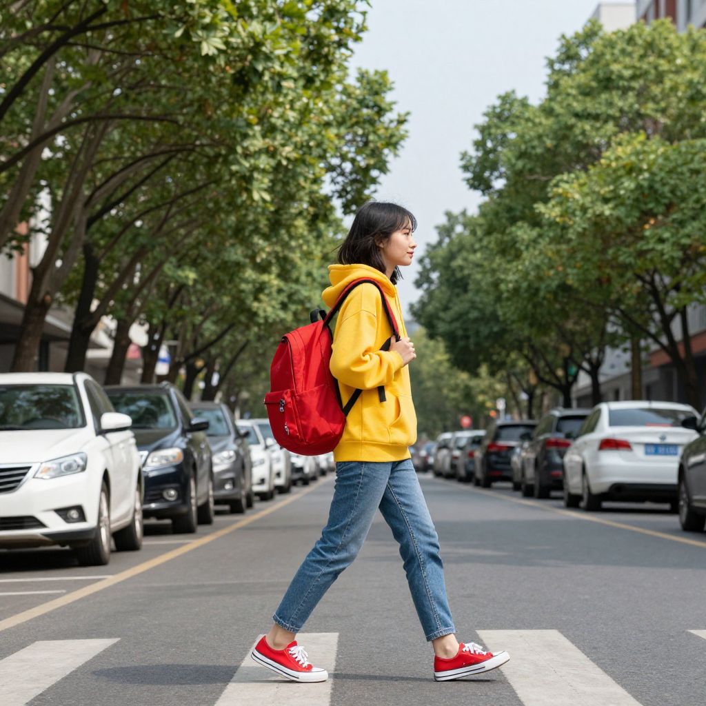 Photograph of an Asian woman with straight black hair, wearing a yellow hoodie, blue jeans, and red sneakers, crossing a city street. She carries a red backpack over her right shoulder. The street is lined with parked cars on both sides and shaded by green trees. The background includes a row of buildings with a mix of modern and traditional architecture. The woman is mid-step, walking from right to left, with a white pedestrian crosswalk beneath her. The image has a vibrant, slightly over-saturated color style.