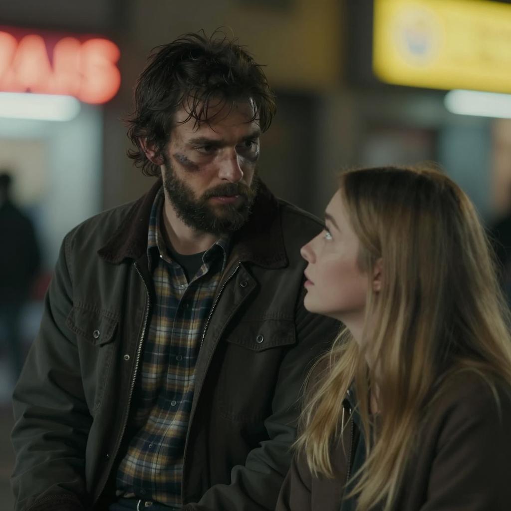 Close-up photograph of a bearded man with dark hair, brown eyes, and a slightly open mouth. He has a bruise under his right eye and is wearing a fur-lined coat with a knitted scarf. His expression is pained and intense. The background is blurred and dark.