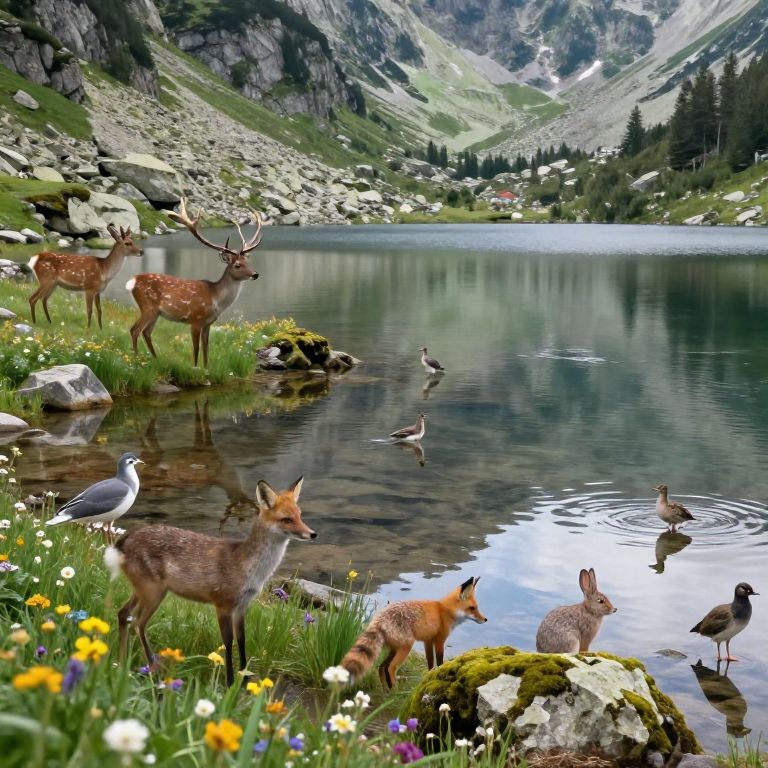 Photograph of a serene mountain lake with deer, foxes, ducks, and geese amidst vibrant wildflowers and rocky terrain, reflecting lush, green
