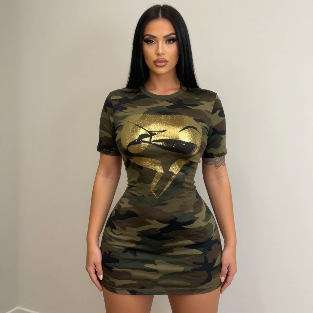 "Woman, streetwear, camouflage print t-shirt dress, short sleeves, round neckline, metallic gold abstract design on chest, thigh-length.. Sexy. Pretty face and beаutiful eyes. Big breasts."