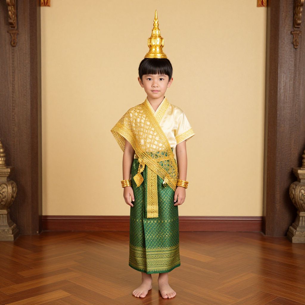 Photorealistic CGI of a young Asian boy in traditional Thai attire, gold and green, with a tall, gold temple hat, standing barefoot on