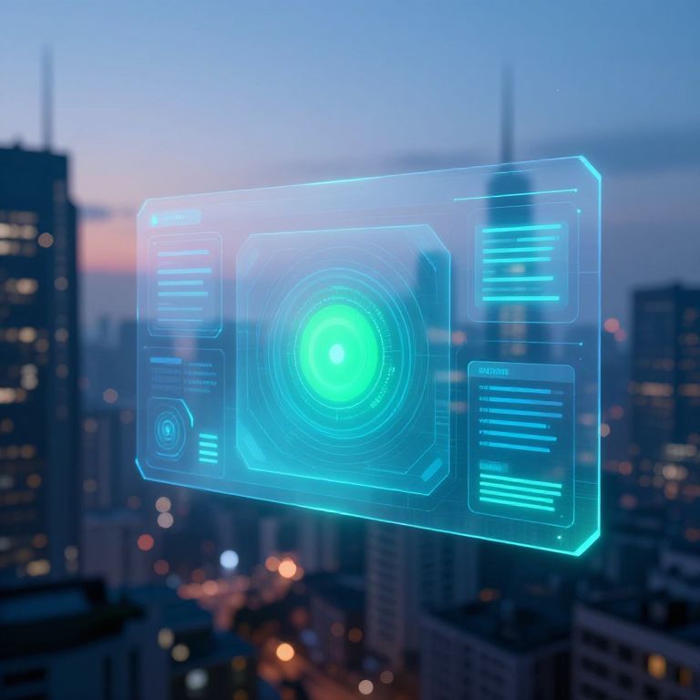 Digital hologram of a glowing blue interface floating above a blurred cityscape at dusk, with illuminated skyscrapers in the background.