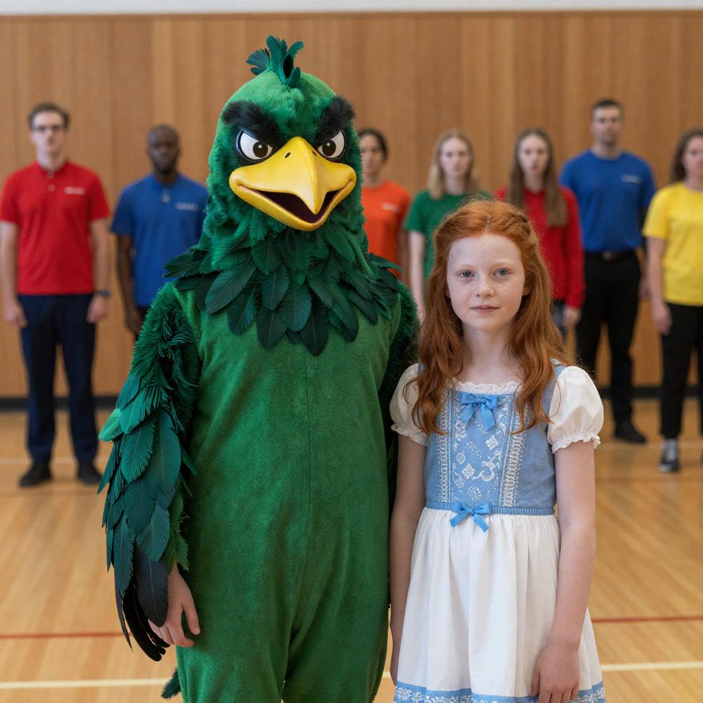 Photograph of a young red-haired girl wearing a blue and white dress standing beside a person in a green feathered bird costume with a yellow beak and intense expression. The background features a wooden paneled wall and a group of people wearing colorful uniforms including red, blue, green, orange, and yellow shirts standing in an indoor gymnasium or hall with bright lighting.