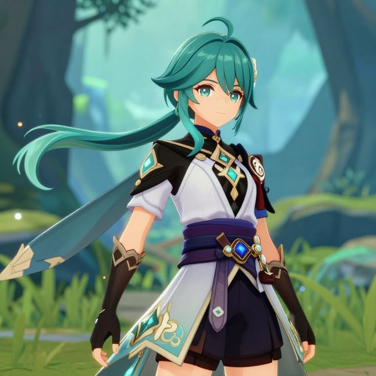 Digital anime-style illustration of a teal-haired, blue-eyed young woman with a long ponytail standing in a lush, forested background. She wears a white and black armored outfit with gold accents, black gloves, and a blue gem-encrusted belt. She holds a large, ornate sword with a blue gem on the hilt. The background features blurred greenery and trees, suggesting a magical forest setting. Her expression is determined, and she stands confidently with her sword at the ready. The art style is vibrant and detailed, with a focus on fantasy elements.