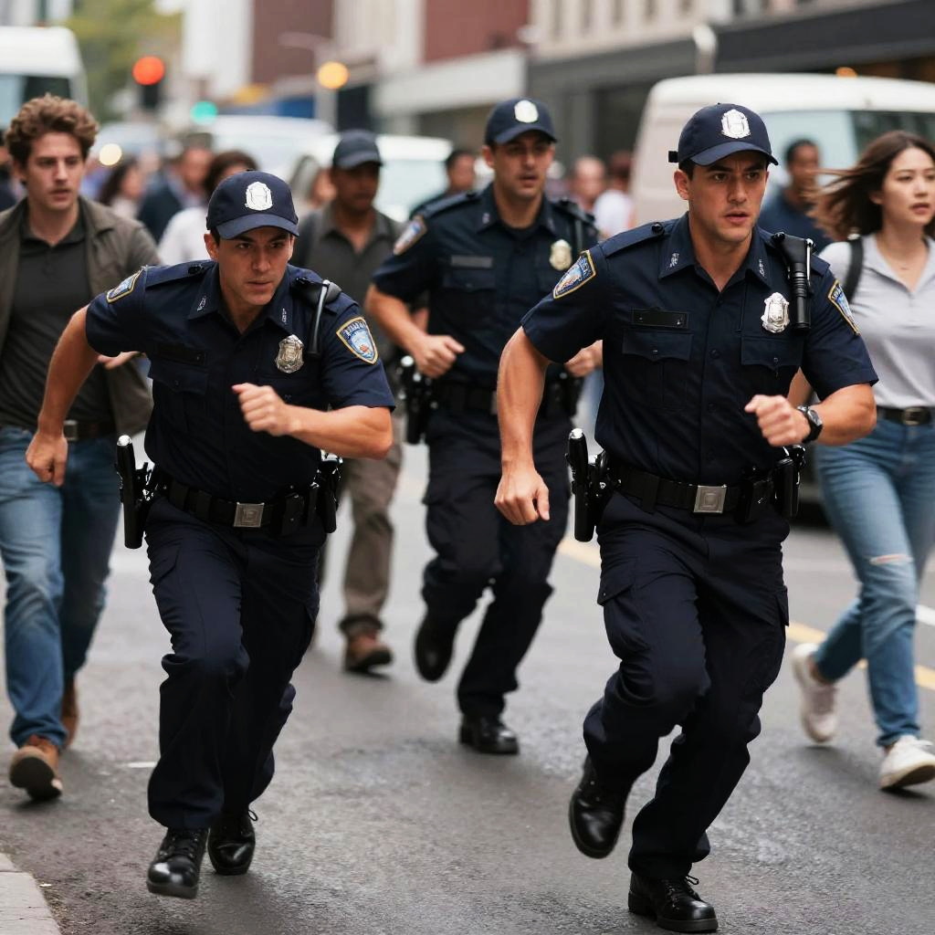 Handsome cops in action scene, chasing suspects through crowded metropolitan streets, dynamic motion blur, expressive faces, urban chaos around, highly detailed, dramatic lighting